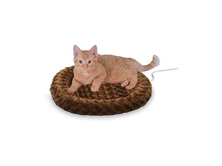 - K&H Pet Products Bolster Heated Cat Bed for Indoor Cats, Thermo-Kitty Fashion Splash Orthopedic Foam Heated Pet Bed for Cats or Dogs, Waterproof Pet Heater, Safety Listed Small 18in Round Mocha