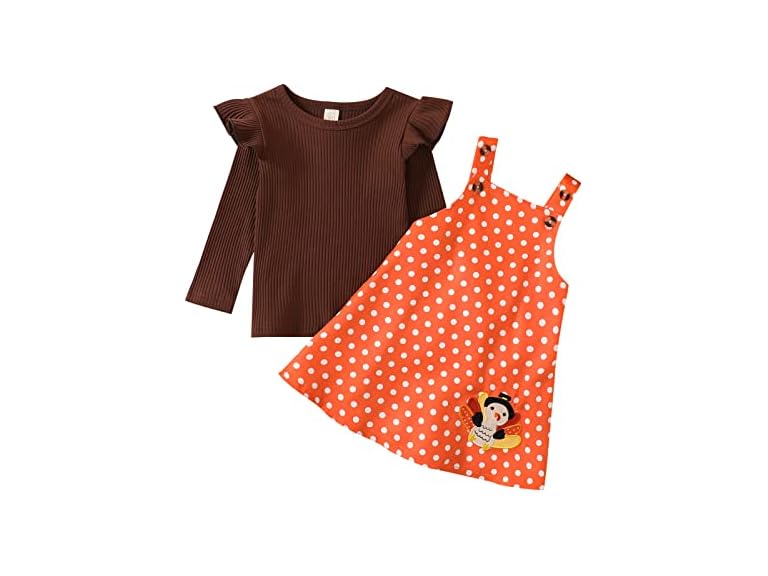 - 🦃Design: Fashion ruffle solid color shirt, orange and brown ,dot and turkey lovely print overalls, it will the best gift for your princess at Thanksgiving.