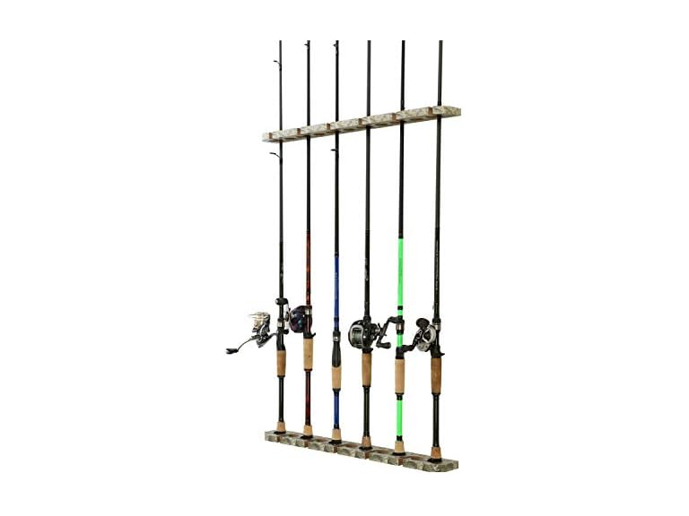 - (1) Old Cedar Outfitters 3-in-1 Hanging Fishing Rod Storage Rack, Hang on Walls Horizontally or Vertically, or on Ceilings, Up to 11 Rod Capacity, 25" x 3.15" x 1.4", Camo Finish (CTIO-011)