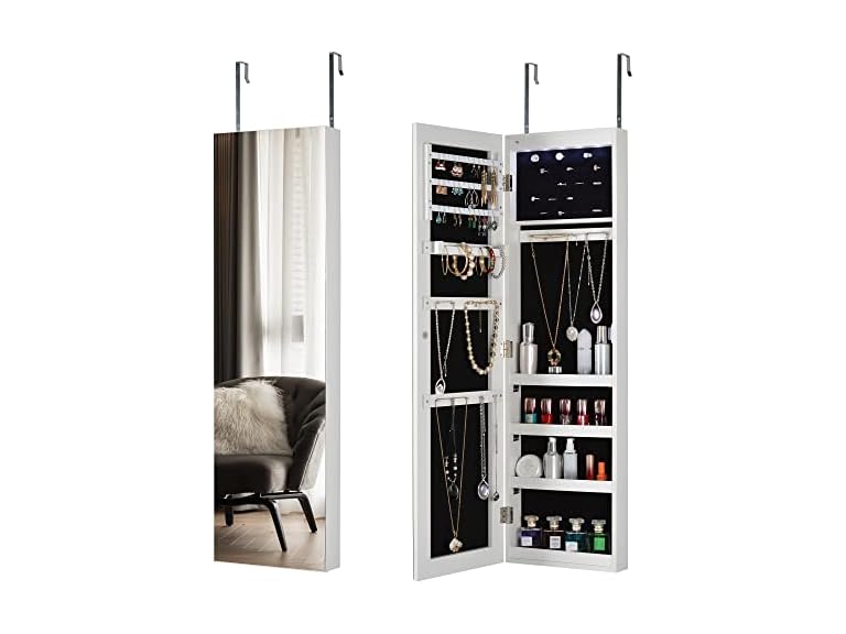 - Practical Use - The Jewelry Armoire Mirror Cabinet combines elegance and functionality with its unique shape and sophisticated design. Opens the mirror to reveal ample storage for all your jewelry and accessories, 4 lined shelves, and a bracelet rod, necklace hooks, and enough room to hold rings and earrings.