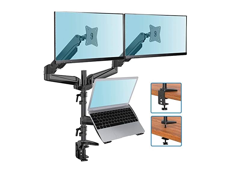- (1) HUANUO Monitor and Laptop Mount, Gas Spring Dual Monitor Stand with Laptop Tray Fit Two 13 to 27 Inch Flat Curved Computer Screens and 10 to 15 Inch Notebooks with C Clamp, Grommet Mounting Base