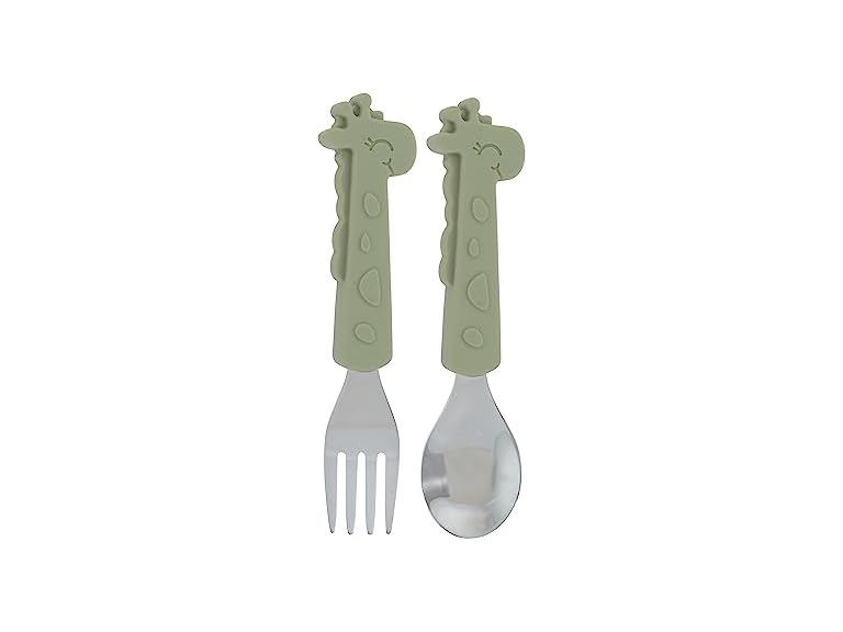 (1) Nuby Animal Friends Silicone and Stainless Steel Fork and Spoon Set - 12+ Months - Green Giraffe
