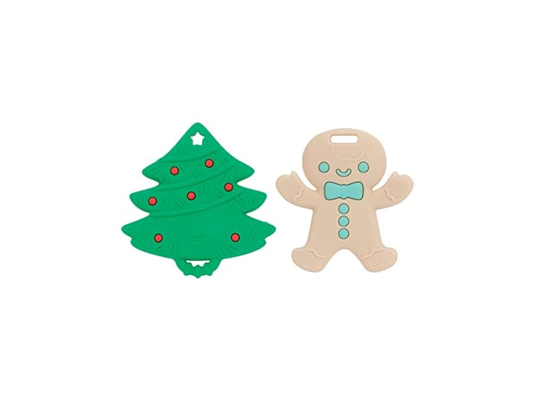 - Adorable silicone holiday tree & gingerbread man cookie teether set is playful, keeps your little one busy and soothes their sore gums.