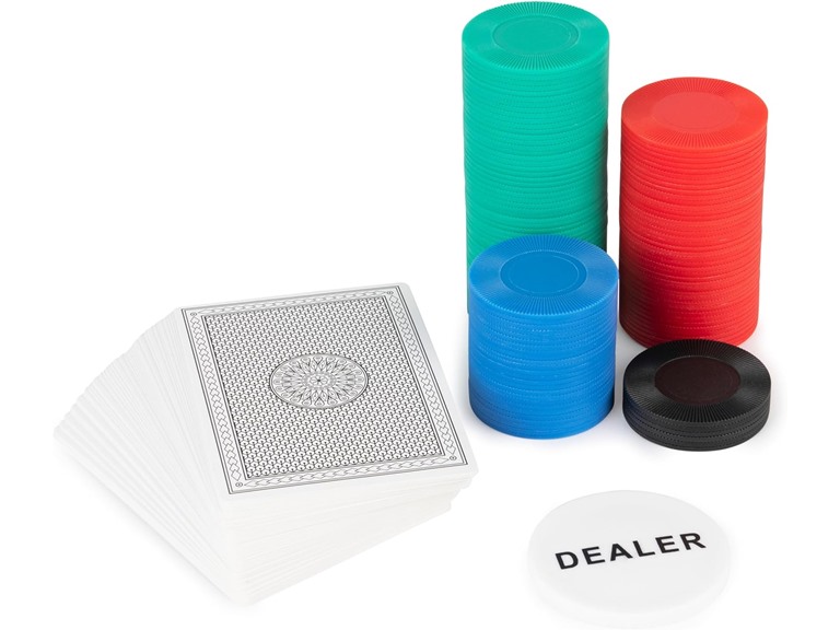 - CLASSIC POKER CHIPS AND CARDS: This set includes everything you need to play- a single deck of standard playing cards, a dealer button, and 200 poker chips in traditional white, blue, red, and green.