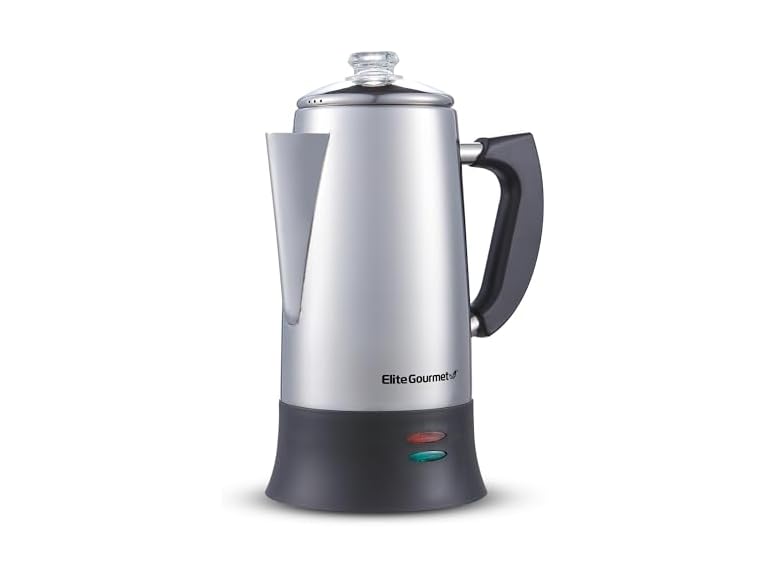 - (1) Elite Gourmet EC922 Electric Coffee Percolator, BPA Free, Keep Warm, Glass Clear Brew Progress Knob, Cool-Touch Handle, Cordless Serve, 12-Cup, Stainless Steel