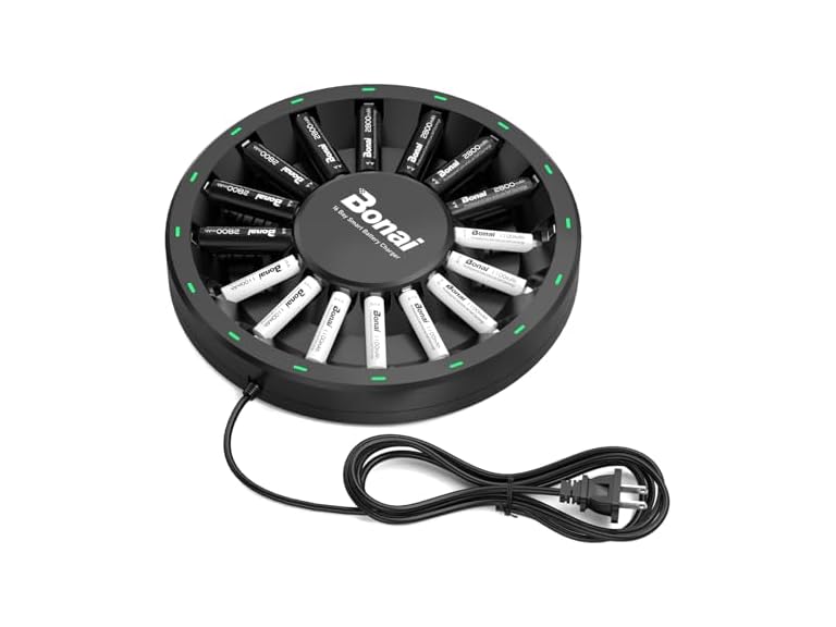 - Rechargeable batteries Charger with Independent-Slot Design,16 slots with 16 LED indicators around displaying the charging process, easily pop Batteries in and out and not worry about having them in pairs