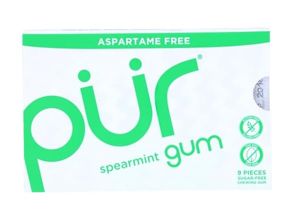 - Chewing Gum – Pur Gum spearmint flavor, 9-piece blister pack of sugar-free, aspartame-free chewing gum.