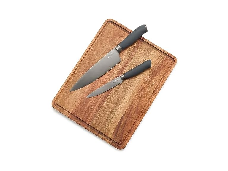 - SET INCLUDES: 8” Chef’s Knife, 5” Serrated Utility Knife, Acacia Wood Cutting Board