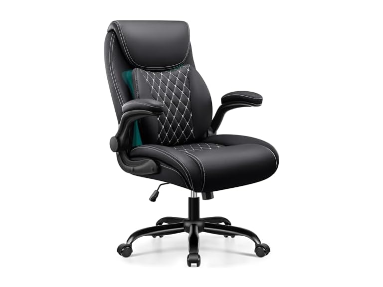 - 【Multi-Functional Flip-Up Armrests】 Our comfortable office chair features soft, space-saving armrests that flip up 90°. The high-quality leather and foam-padded armrests protect your elbows from bumps. Lower them for ergonomic typing support, or raise them for unrestricted movement – perfect for adapting to different workspace tasks.