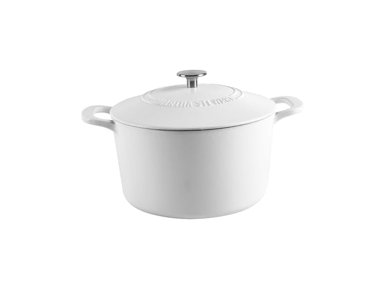 The Martha Stewart Gatwick 7-quart Enameled Cast Iron Dutch Oven with Lid provides versatility and durability while making all kinds of delicious recipes every day. Crafted from durable cast iron, this piece distributes and retains heat evenly to slow cook stews, braise meats, bake casseroles, and more. The vibrant enamel finish resists stains for elegant presentation and easy cleanup. Sturdy handles offer balance and support when serving from oven to table. The lid has raised grooves to redirect moisture back on the food for tender, flavorful results. Safe in the oven (up to 500°F) and on all cooking surfaces, including induction stoves, this Dutch oven offers style and performance to inspire any home cook to explore and do more in the kitchen. Hand wash only. Embrace thoughtfully designed home essentials from America’s most trusted lifestyle expert, Martha Stewart. Step into her exquisite and iconic world filled with a curation of high-quality products to prep, cook, bake, serve, and enjoy. All crafted to elevate everyday homemaking and seasonal entertaining, these kitchen and tabletop pieces blend style and performance, inspiring avid hosts and home cooks to set stylish tables, serve up delicious meals, and create spectacular memories.