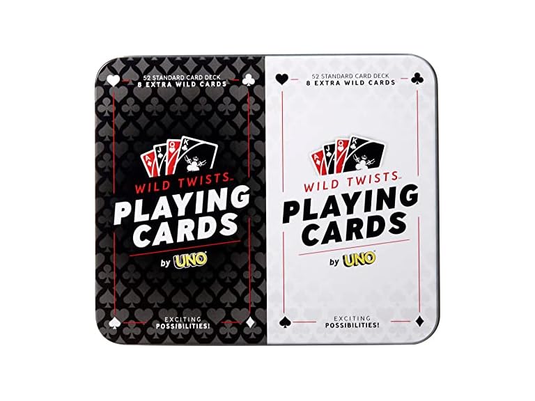 - (1) Mattel Games Wild Twists Playing Cards by UNO Brand, 2 Sets of Standard 52-Card Deck Plus 8 Special Wild Cards in Storage Tin