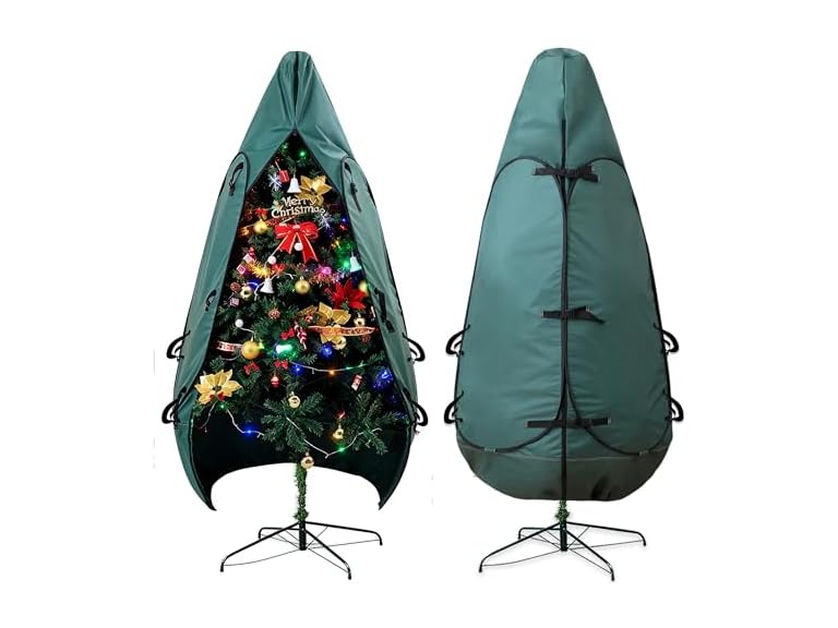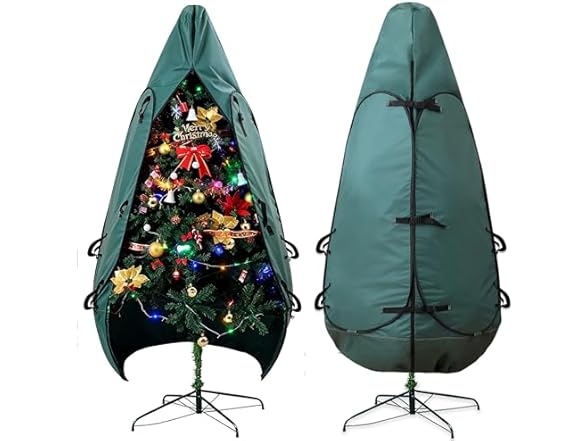 - Quick and Easy Setup: Designed for efficiency, our Christmas tree storage container features dual zip-top openings for effortless installation. Simply unzip, slide in your tree, secure the clips, and zip it closed. Unlike traditional artificial tree storage bag that force you to dismantle your tree, our upright Christmas tree tent design keeps your tree fully intact. The innovative drawstring closure at the base ensures a snug fit, making storage simpler than ever!