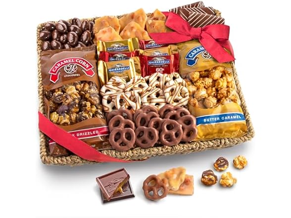 - A gift large enough for the whole office and entire family. Added to the caramel corns and Ghirardelli's finest are heaping handfuls of chocolate-covered sea salt Cashews, chocolate-covered pretzels, caramel drizzled pretzels, peanut brittle, and scrumptious handmade chocolate Almond bark.