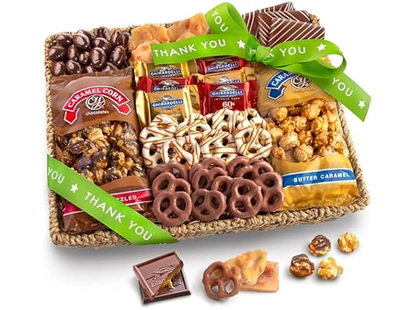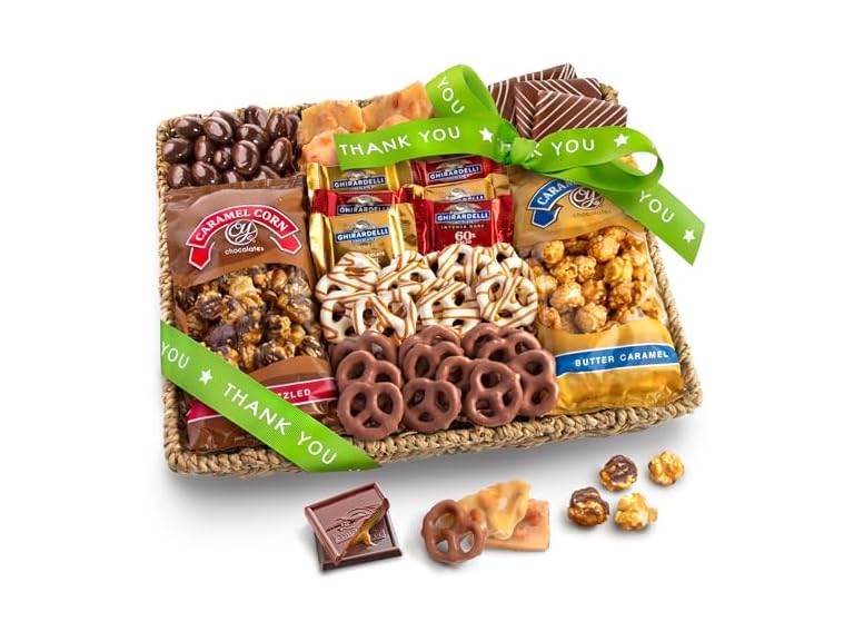 - A gift decadent enough to say "thank you" More treats include Ghirardelli Chocolate, chocolate-covered sea salt Cashews, chocolate-covered pretzels, caramel drizzled pretzels, peanut brittle. State of Readiness: Ready to Eat
