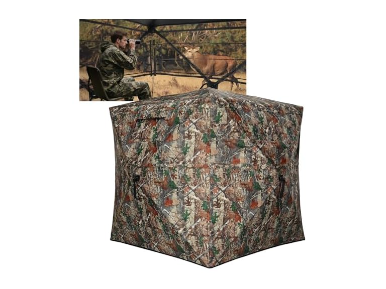 - Unobstructed 270 Degree View: This 270 Degree See Through hunting blind is equipped with three full panels of one-way see through mesh, which can allows hunters to observe 270-degree unobstructed wide view angle surroundings