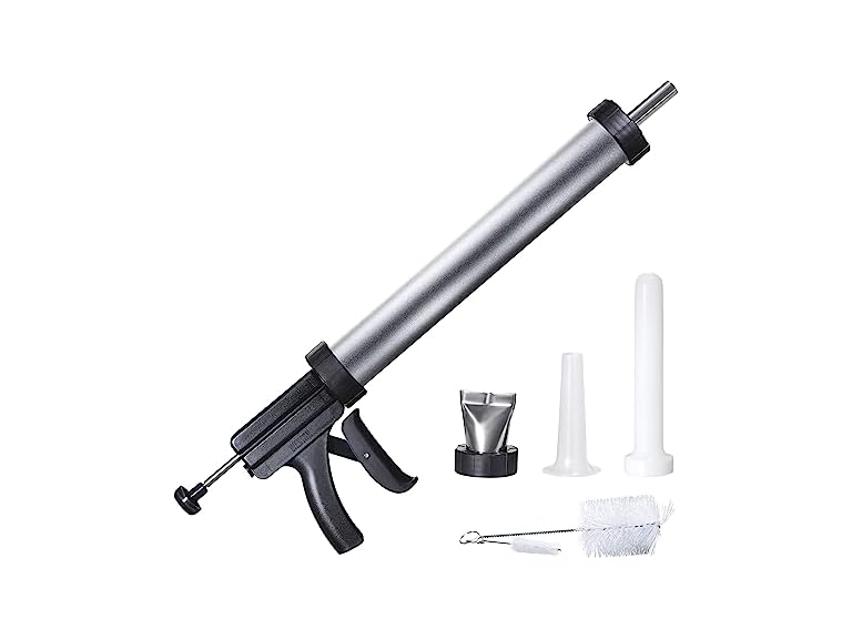 - INCLUDES EVERYTHING YOU NEED TO GET STARTED: The jerky gun kit comes with a stainless steel double-barrel jerky nozzle, double snack stick nozzle, plastic sausage funnel, stomper and two cleaning brushes.