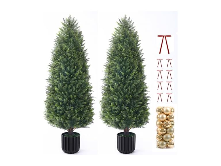 - 4FT Artificial Cedar Topiary Trees Set of 2, Extra Dense Foliage UV Resistant Fake Plants for Front Porch Christmas Decor, Lifelike Fake Trees