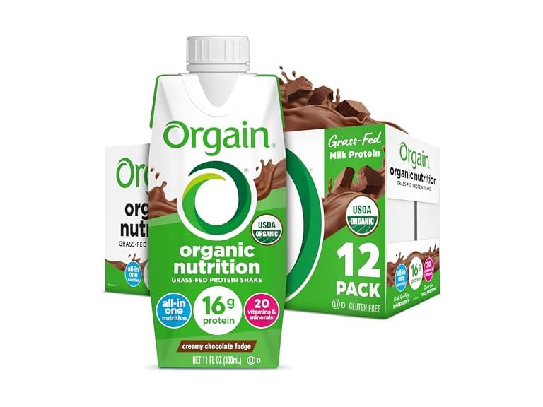 - WHAT TO EXPECT: Includes 12 (11 Fl Oz) Orgain Organic Nutritional Creamy Chocolate Fudge Ready to Drink Shakes. This is a grass-fed variant containing milk and whey protein. For a complete vegan alternative, try our plant based nutritional shakes.