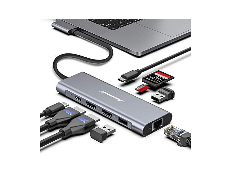 - Born for Magnify Your MacBook Pro/Air: Don't want to carry around multiple expensive Mac adapters, dongles, or cumbersome docking stations? The Hiearcool Triple-Display Innovation combination of USB C Hub and docking station is the ultimate accessory for your MacBook Pro/Air, more features, more possibility, light-weight and portable. The new Hiearcool USB C docking station features 2 X 4K HDMI, SD/MicroSD Card Reader, USB C Data Transfer, 100W PD, and 2 x USB 3.0 ports.