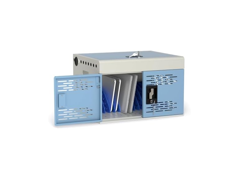 - (1) 16-Unit Charging Cabinet for Laptops & Tablets - Locking Laptop Storage Box with Cable Management, Charger Storage, and Ground Protection - Great for Classroom, Library, and Office(Blue)