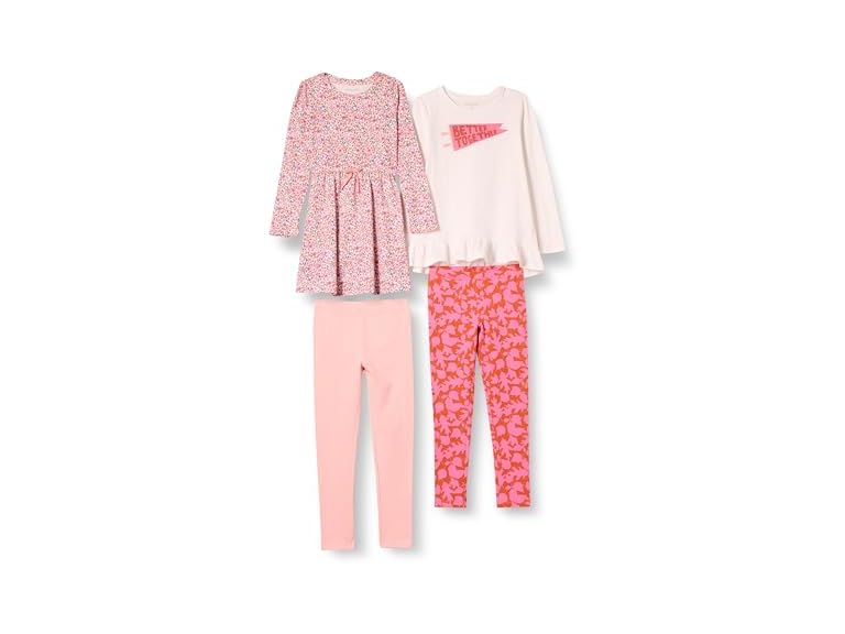 - DETAILS: Packs feature long-sleeve dress and tunic with coordinating full-length leggings. The dress has an elasticated waist with decorative bow detail and pockets, and the tunic features a ruffle flounce at hem.