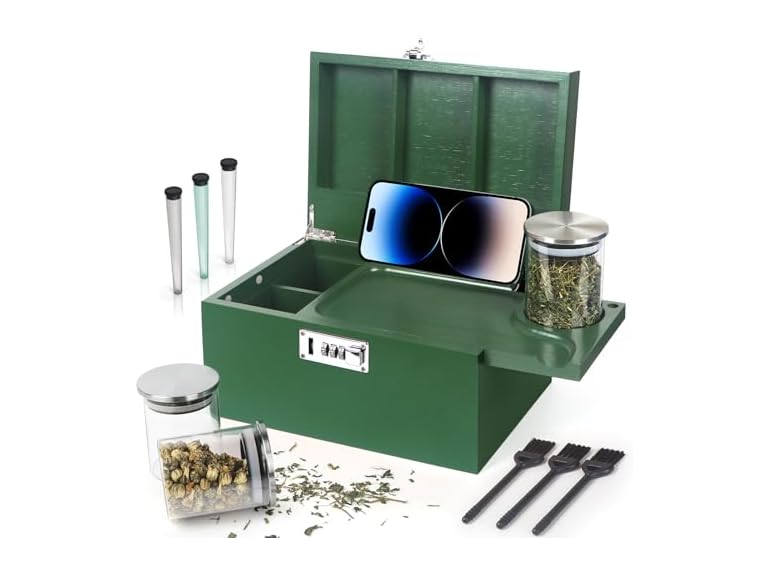 - (1) Large Green Bamboo Box with Combination Lock, Decorative Storage Box with Removable Tray & Detachable Compartment, Wooden Boxes with Alright Jars & Brushes & Storage Tubes