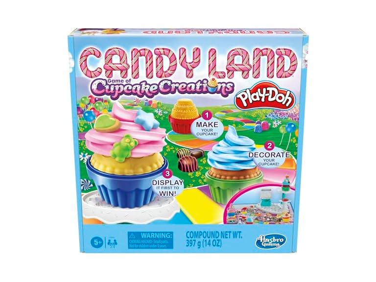- (1) Hasbro Gaming Candy Land Cupcake Creations, Kids Board Game with 7 Play-Doh Cans and Tools