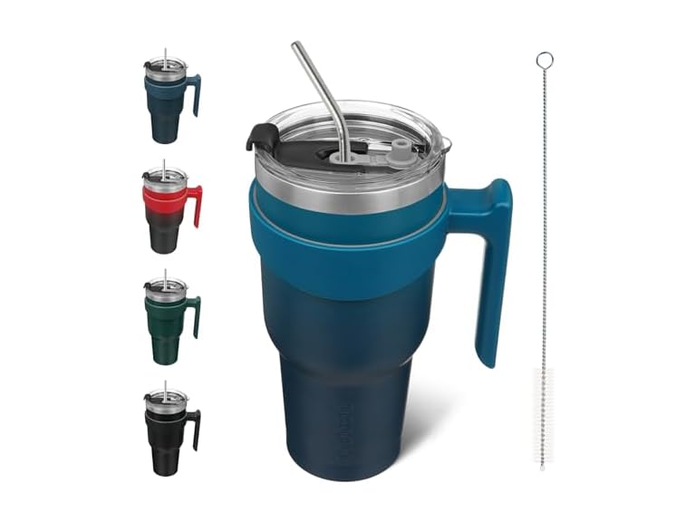 - Cupholder Friendly Travel Mugs With Handle: The Insulated Cups Has a Narrow Bottom And A Wide Mouth Fits Most Cup Holder In Car, With Detchable Handle And Reusable Straw To Use More Portable, You Can Stay Sipping From Your Essential Hydration Companion, Even On Your Busiest Days