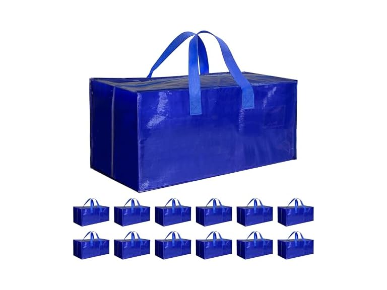 - (1) 12 Pack Oversized Heavy Duty Moving Bags with Backpack Straps, Strong Handles & Zippers, Extra Large Storage Tote Moving Boxes for Space Saving, Blue