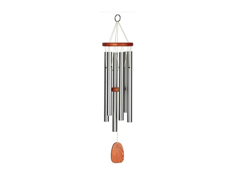 PRODUCT FEATURES. Measuring 24-inches in overall length (total hanging length is measured from top of gather ring to bottom of wind catcher), this chime features an ash wood top with a beautiful cherry finish that is weather-resistant and 6 high-polish silver aluminum tubes that will not rust when exposed to the elements.