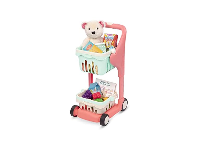 - Includes: This play set comes with an adjustable shopping cart, 2 removable baskets, a board book, a machine-washable teddy bear, and 25 pieces of play food.