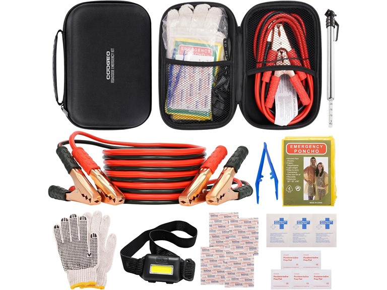 - Everything You Need For Car Safety In One Bag: Contains: LED headlight; emergency poncho; non-slip work gloves; first aid bandages; tire pressure gauge; sturdy battery jumper cables; povidone iodine prep pads; non-adhesive sterile pads; tweezers; tools are neatly packed in a black bag with carabiner for easy tool storage and carrying
