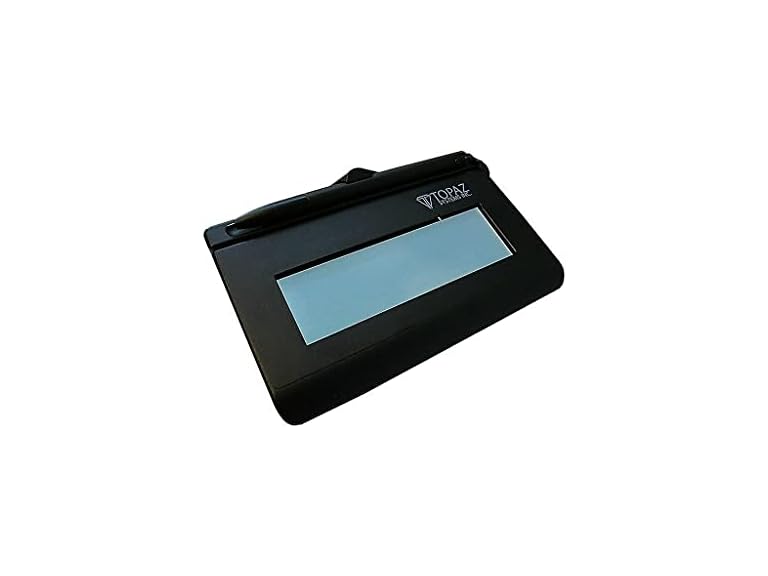Collect digital signatures by using this Topaz SigLite LCD USB backlit electronic signature pad, which comes equipped with a third-generation signing surface. Reduce the need for signatures on paper by using this signature capture pad that includes a bundled software suite for user-friendly modifications. The backlit LCD screen of this pad provides precise captures and displays affirmation text for signing context. This Topaz SigLite signature pad features a sturdy, battery-less digitizing pen and a third-generation sensor that is rated for one million signatures. Signature pad with transflective LCD that displays electronic ink under the pen tip during signing. Pad dimensions: 3.8"H x 6"W x 1.4"D. This model shows the signature on the signature pad, as well as the computer screen. The signature pad has USB interface and is backlit. Third-generation touchscreen is rated to one million signatures. This pad features rugged passive pen and tether. Exceeds industry standards, programmable PPI. Small size and weight for portability. Authentication: forensic-quality .SIG data capable of examination and authentication with Topaz software. 2-year manufacturer limited warranty. The Topaz SigLite LCD 1X5 pressure-sensitive electronic signature capture pad with backlit in black, has signing area of 4.4" x 1.3". It supports simultaneous electronic and ink-on-paper recording of signatures. It has thin and lightweight design for easy portability. It features all high-quality biometric and forensic capture techniques. It uses 3rd-generation touch-screen signing surface for cost efficiency. The LCD screen displays affirmation text for greater signing context and has USB interface for external connectivity.
