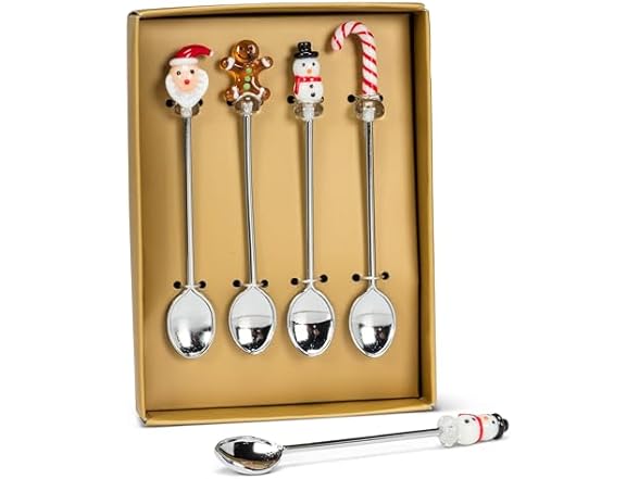 - Design: Set of 4 spoons, each topped with a festive glass icon including Santa, a gingerbread man, snowman, and candy cane for a cheerful holiday touch