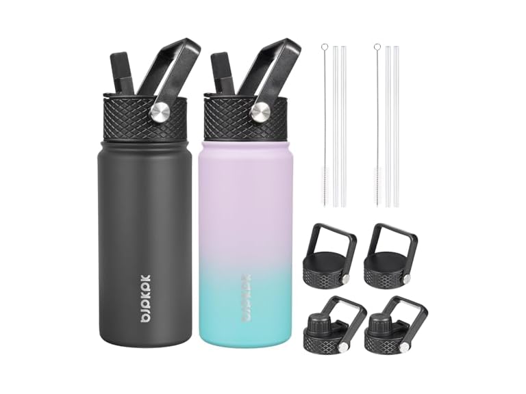 - FULLY EQUIPPED: BJPKPK 2 pack metal water bottles equipped 2 insulated water bottles, 6 lids, 4 straws and 2 straw brush to meet your every need. Flex removable lids for drinking smoothie or fruit drinks. Spout lids for hot water. Straw lids for iced beverages. All of the 6 lids are convenient to carry, BPA FREE and leak proof