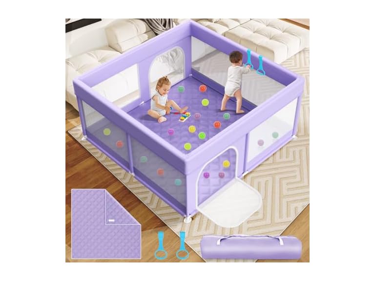 - [Stylish Purple Look & Quick Setup] Assembled effortlessly in minutes without tools, this baby playpen features rust-resistant alloy steel tubes and strong ABS connectors for lasting durability. The modern purple design blends beautifully into any nursery or living space, combining function with aesthetic appeal. Perfect as a large playpen with mat for growing toddlers and curious little ones.