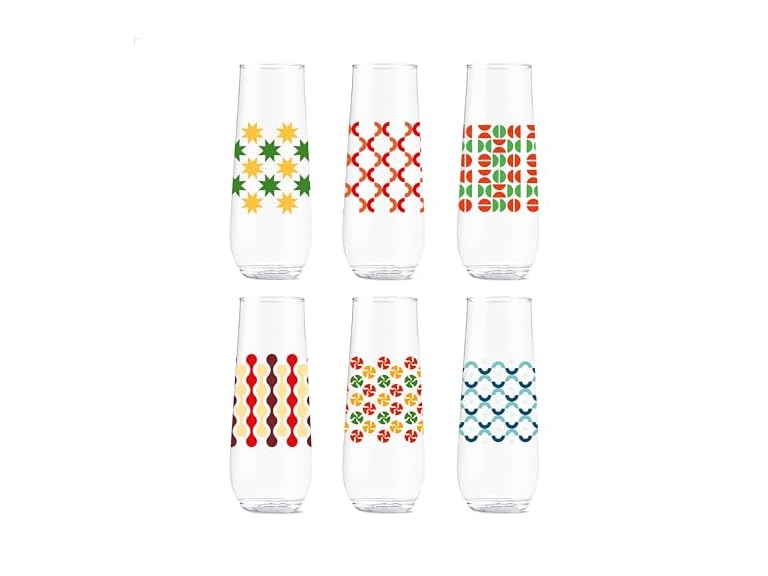 - (1) TOSSWARE POP 9oz Flute Abstract Christmas Series, SET OF 6, Premium Quality, Recyclable, Unbreakable & Crystal Clear Plastic Printed Glasses