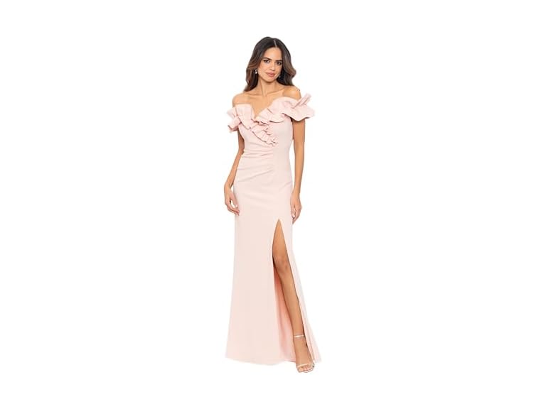 - (1) Xscape Women's Long Stretch Scuba Crepe Ruffle Collar Ruched Dress, Blush, 16