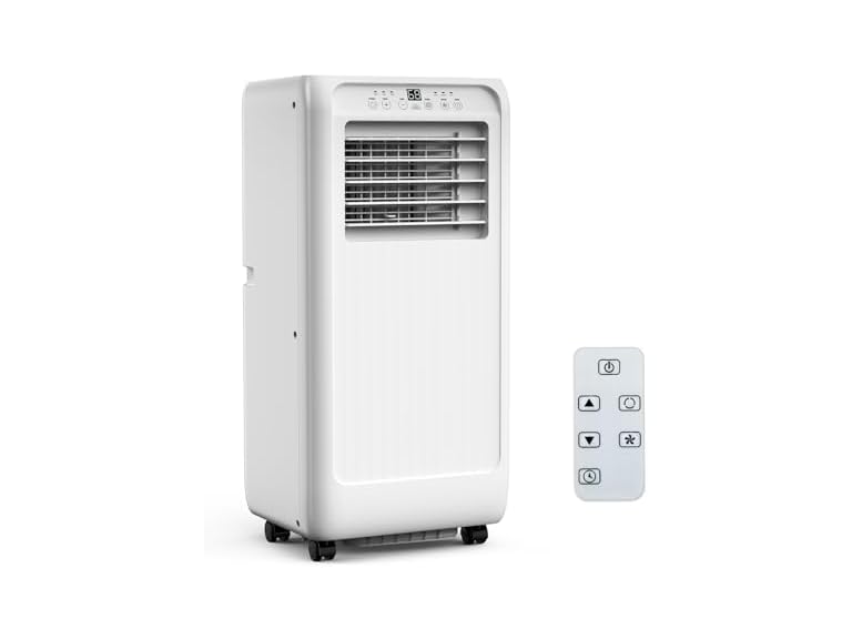 - (1) Vossfamul 10000 BTUs Portable Air Conditioner, Cooling, Dehumidifying, Fan 3-in-1 Mode, with Remote Control & Retractable Window Kit, LED Display, 24H Timer, Cools up to 450 Sq. Ft. for Home Office