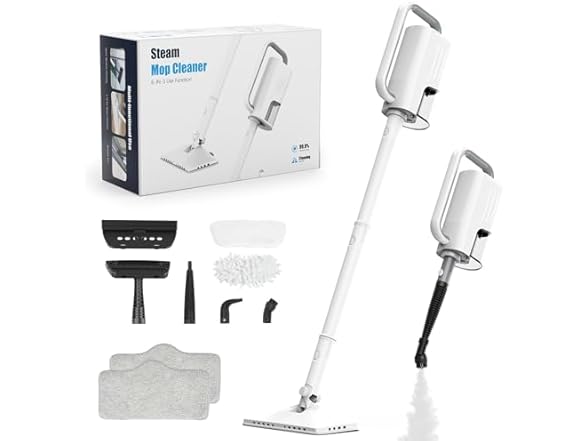 - The steam mop with attachments can help you clean hardwood, laminate, marble, tile and other materials, while the 5 different replacement heads can also help you clean water stains on bathroom windows, grease stains on kitchen stoves, desktop dirt and even basic ironing can be easily done. The steam mop is a good helper for your home cleaning!