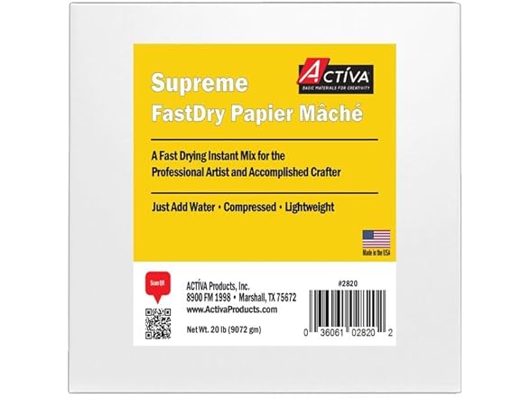 First invented in China during the 8th century, papier mache is an important material for artistic expression that continues today. Long favored by artisans for its ease of use and high-performance results, it has been a favored medium for artists, artisans and craft enthusiasts. Introducing Supreme FastDry Papier Mache, the premium, high-quality, instant paper mache mix designed specifically for demanding artists needing the best materials to realize their artistic vision. Elevate your experience with this easy-to-use, no-mess, instant mix. This special, proprietary formula is made to exacting specifications for unmatched consistency and predictable, repeatable results. Exceptionally durable when dry, create pieces with no imperfections and an exxceedingly smooth, flawless finish. Transform your vision into reality where imagination knows no bounds. Supreme FastDry Paper Mache is an easy one-step process; remove what you need from the package, just add water and mix to the desired consistency. Made from 100% recycled paper, it mixes easily with minimal dust. There’s no need for the tedious cutting paper strips or adding paste. Once mixed it molds quickly, is easy to handle and adheres to almost any surface. It air dries in about half the time as traditional paper mache to a hard, durable, strong and light finish. It accepts paint and other finishes exceptionally well. Add texture, detail, patterns and designs with ease. Make intricate sculpture, decorative accents, masks, dioramas, even volcanos, one is only limited by one’s imagination. So versatile, once dry it can be sanded, sawn, cut or drilled as needed. Clean up is easy with just soap and water. Safe, non-toxic and non-staining, it meets or exceeds all US and European testing standards. Since its founding in 1959, ACTIVA Products has been the industry leader in supplying the highest quality materials for creativity. For artists, crafters, designers and educators, ACTIVA provides the right tools and products for artistic expression. Whether the need is for instant papier mache, air dry clays and plasters, vibrant sand, casting, sculpture or floral design, ACTIVA products provide the quality, consistency and proven performance expected by even the most demanding artisan. All our products are 100% safe, non-toxic and meet or exceed all US and European testing standards. ACTIVA Products, Materials for Creativity.