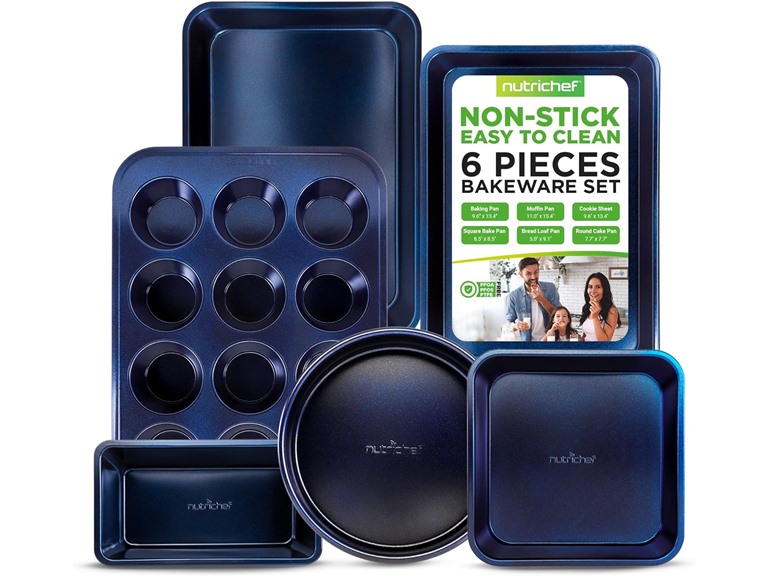 - 6-PIECE SET: NutriChef 6-piece nonstick cookware set includes cookie sheet tray, wide baking pan, square bake pan, oven muffin pan, bread loaf pan, and round cake pan. These are a flexible, stylish and non-stick carbon steel bakeware set