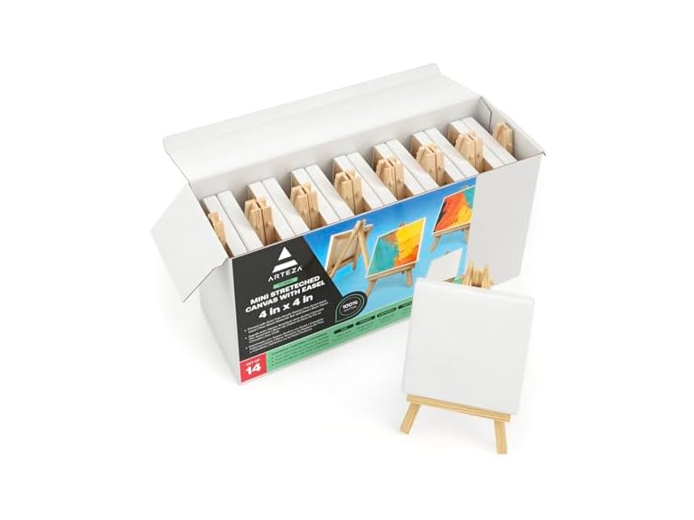 - ARTEZA Mini Canvases for Painting with Easels, Pack of 14, 4 x 4 Inches, 100% Cotton, 8 ounces Primed Stretched Canvas Bulk, Pine Wood Easels