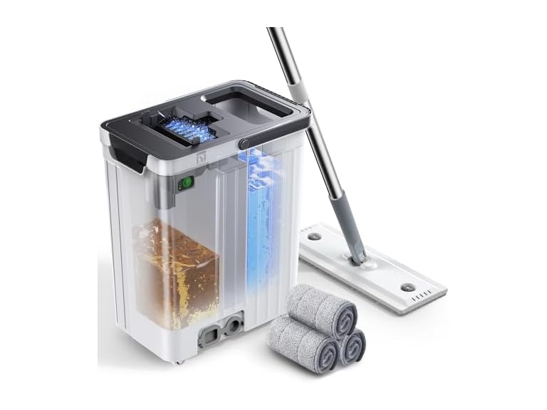 - 🔵 Compact Design & Bottom Wheels — Simple Storage and Smooth Mobility. The slim, upright design fits neatly beside washers, inside closets, or in small storage spaces without taking up room. Built-in bottom wheels let you move the bucket effortlessly even when it’s filled, helping keep your cleaning routine more organized. Includes three machine-washable mop pads for extended, reusable use.