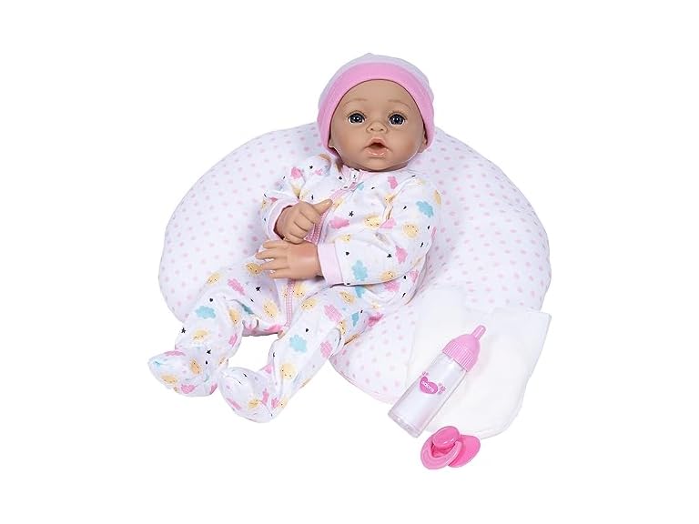 - 7-PIECE DOLL SET - This Adora Sunshine baby doll set includes one 14" realistic baby doll with open/close eyes, a removable cloud and sun printed zippered onesie, a matching beanie, a pink adoption baby pacifier, a white/pink polka-dot feeding pillow, doll diapers, and a milk bottle