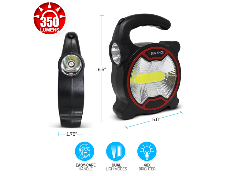 This compact 2-in-1 LED light features dual light modes for maximum versatility. The 350-lumen COB work light provides wide, diffused illumination for lighting up work areas—ideal for camping, garages, home repairs, and power outages. The focused flashlight beam delivers long-range visibility, perfect for walking at night, outdoor navigation, and searching at a distance. Producing up to 40× brighter light, it includes an easy-carry handle for comfortable, portable use indoors or outdoors. The Adurance 2-in-1 Easy-Carry Flashlight & Work Light is a high-performance, versatile lighting tool designed for both professional and recreational use. It combines a powerful focused beam with a high-intensity COB work light to provide comprehensive illumination for any environment.