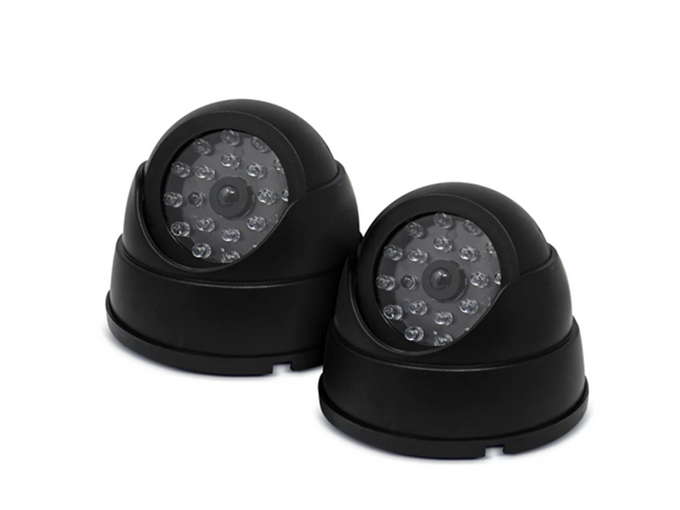 Enhance your home or business security with this realistic Set of 2 Decoy Security Cameras. Designed to mimic the look of real surveillance cameras, each unit features a flashing red LED light to simulate active monitoring, deterring potential intruders or vandals.
