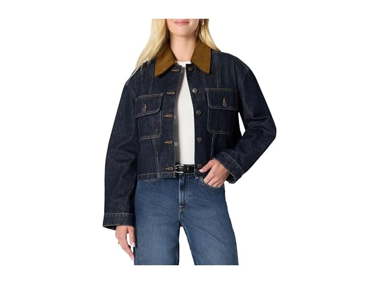 - CROPPED DENIM JACKET WITH CONTRAST COLLAR: Heritage-inspired jacket with corduroy collar in a modern abbreviated silhouette that works equally well over jeans or dresses