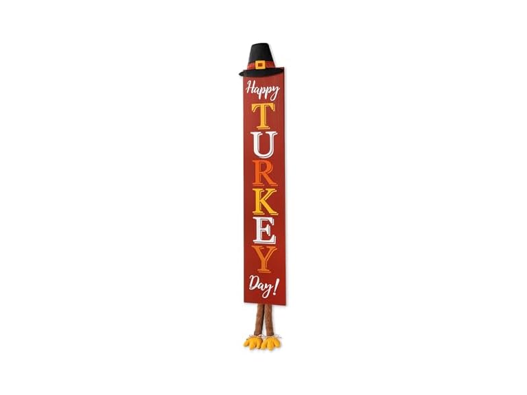 - (1) Glitzhome Wooden Happy Thanksgiving Porch Sign Farmhouse Standing/Hanging Turkey Decor with Fabric Dangling Legs, 58.5"H