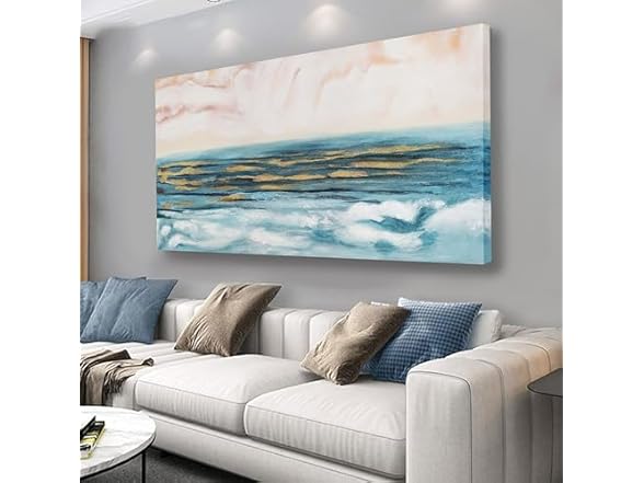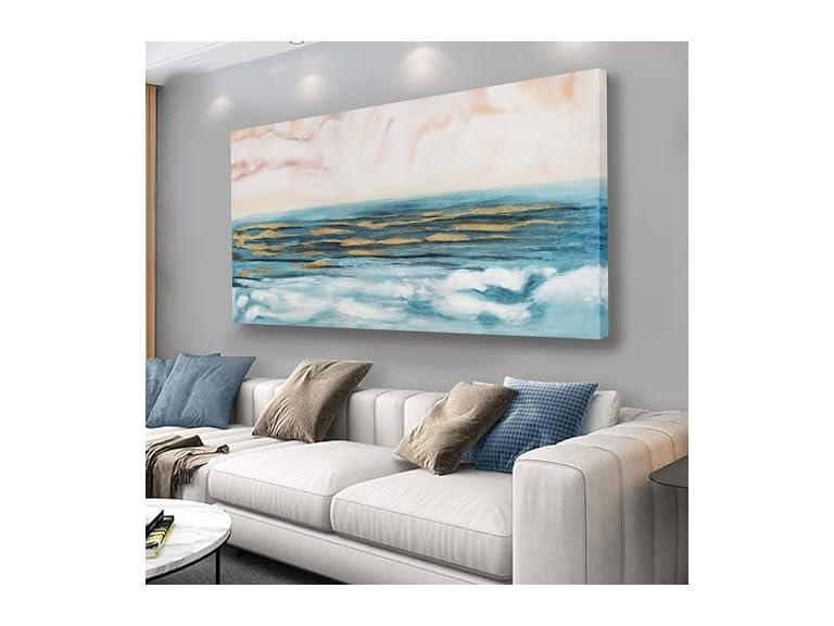 - (1) AERART Canvas Wall Art Blue Gold Coast Seascape Abstract Wall Decor Painting Framed Artwork Living Room Bedroom Office Home Wall Decor 24"x48"